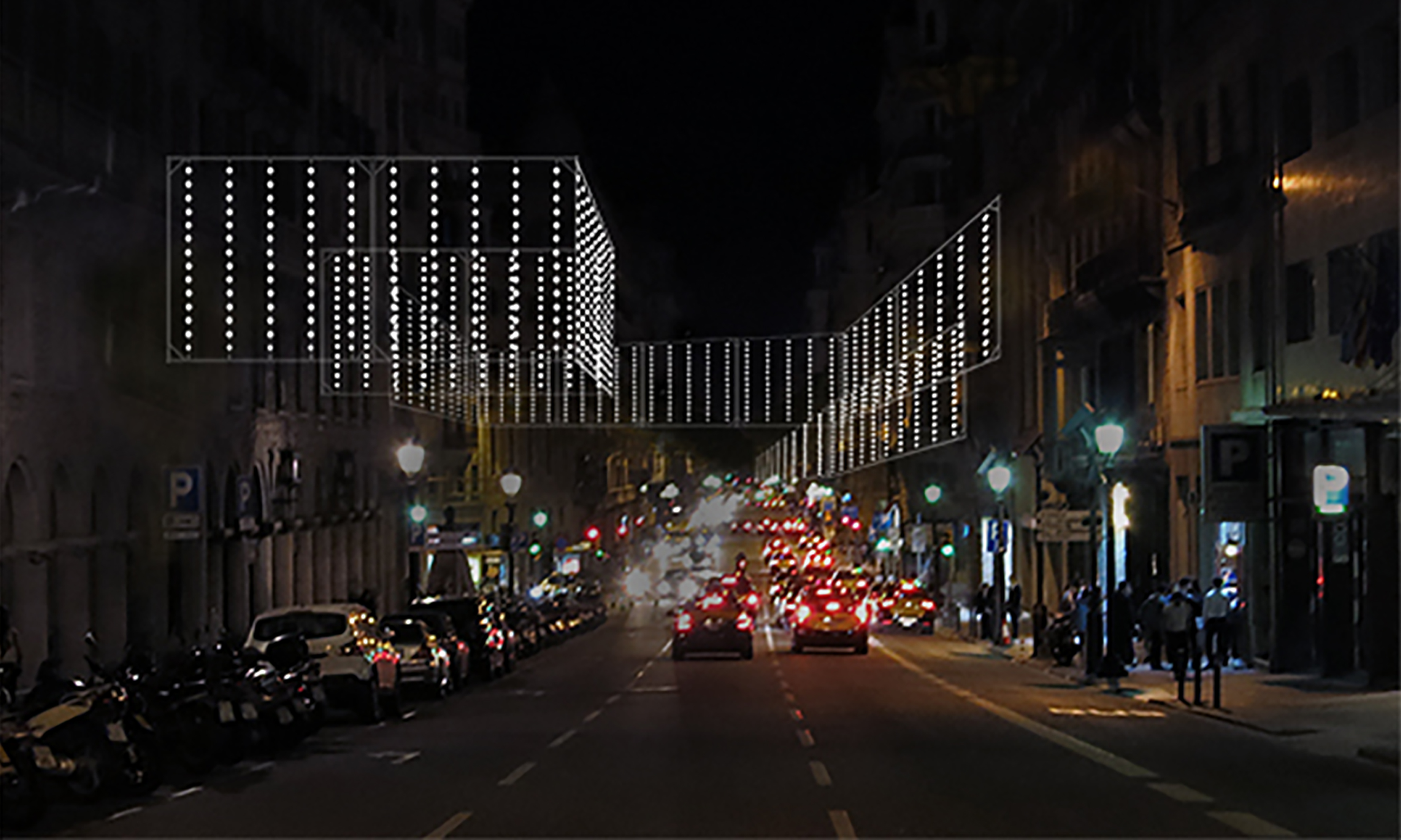 facades and the narrow streets. Lighting curtains, apparently aleatories,